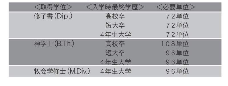 - 基礎課程単位を含み修了証(Dip.)は72単位以上、神学士(B.Th.)もしくは牧会学修士(M.Div.)(4年生大学卒)は96単位の履修が求められます。(但し、高校卒で神学士を目指す者は108単位)。